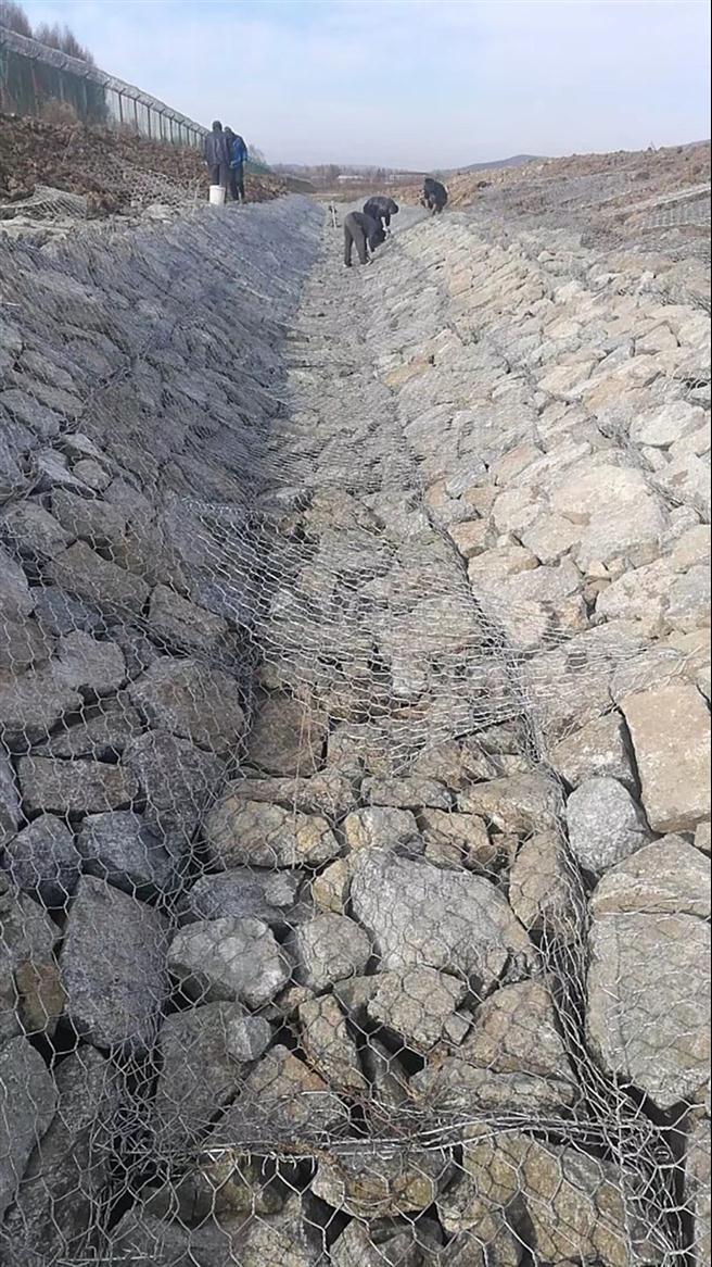 將網(wǎng)籠錯(cuò)縫擺設(shè)就位,避免出現(xiàn)縱向貫通縫。將網(wǎng)籠四邊立起,用綁線將相鄰邊沿扎緊,在綁扎過程中避免高鍍鋅損傷。