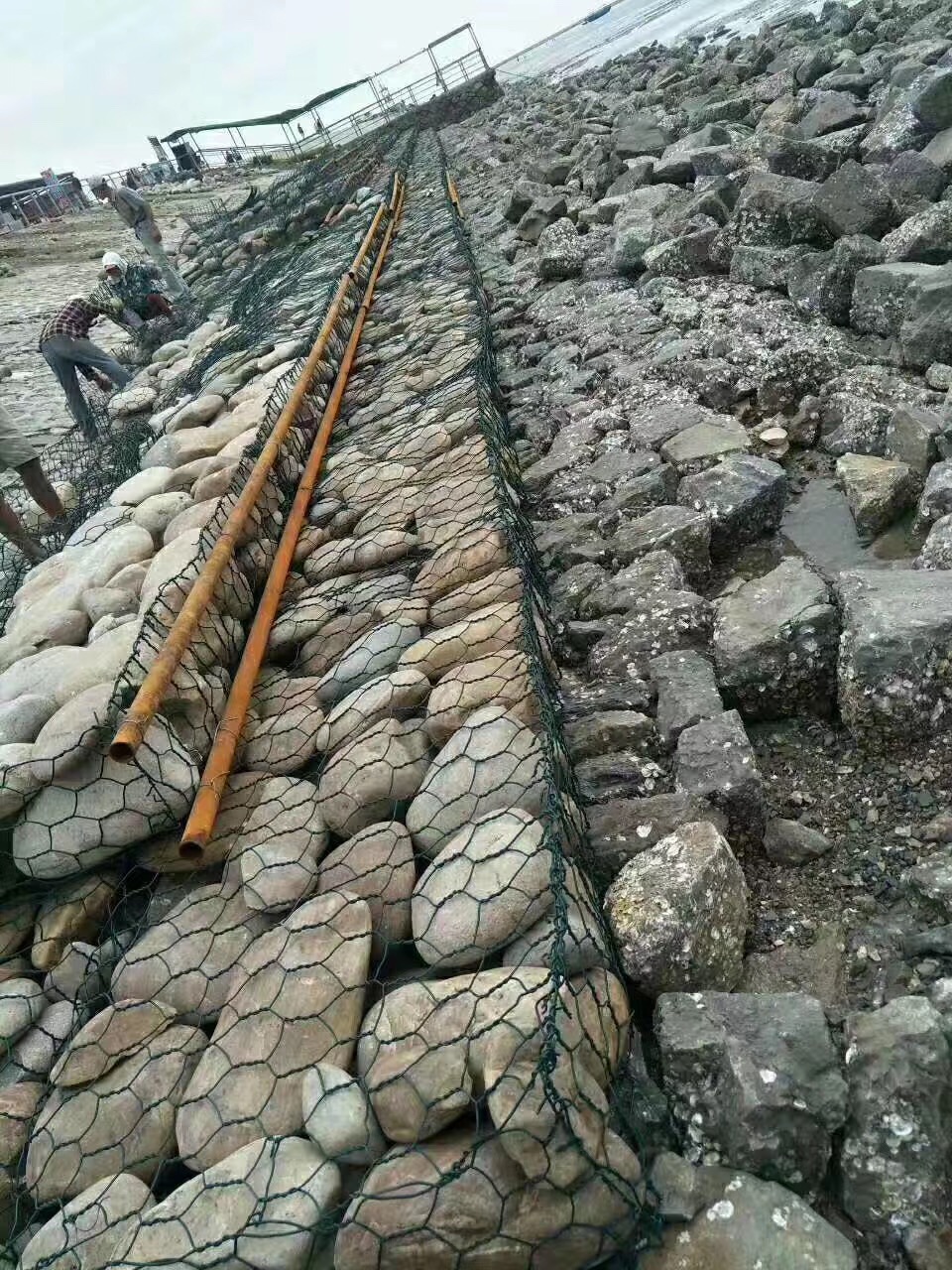 固濱籠是由經(jīng)表面防蝕處理的低碳鋼絲用機械編織的雙絞六角形柔性金屬網(wǎng)制成。將金屬網(wǎng)綁扎成不同結(jié)構(gòu)和尺寸的相互連接的網(wǎng)籠、網(wǎng)墊,填入適當?shù)氖瘔K,然后綁扎蓋網(wǎng)形成的石籠、石墊整體護面。固濱籠為剛?cè)?/span>“板塊”。柔中帶剛,透水性好,有利于補充堤外水源。“板塊”可以抵抗坡面外水沖刷,也可排除內(nèi)水。